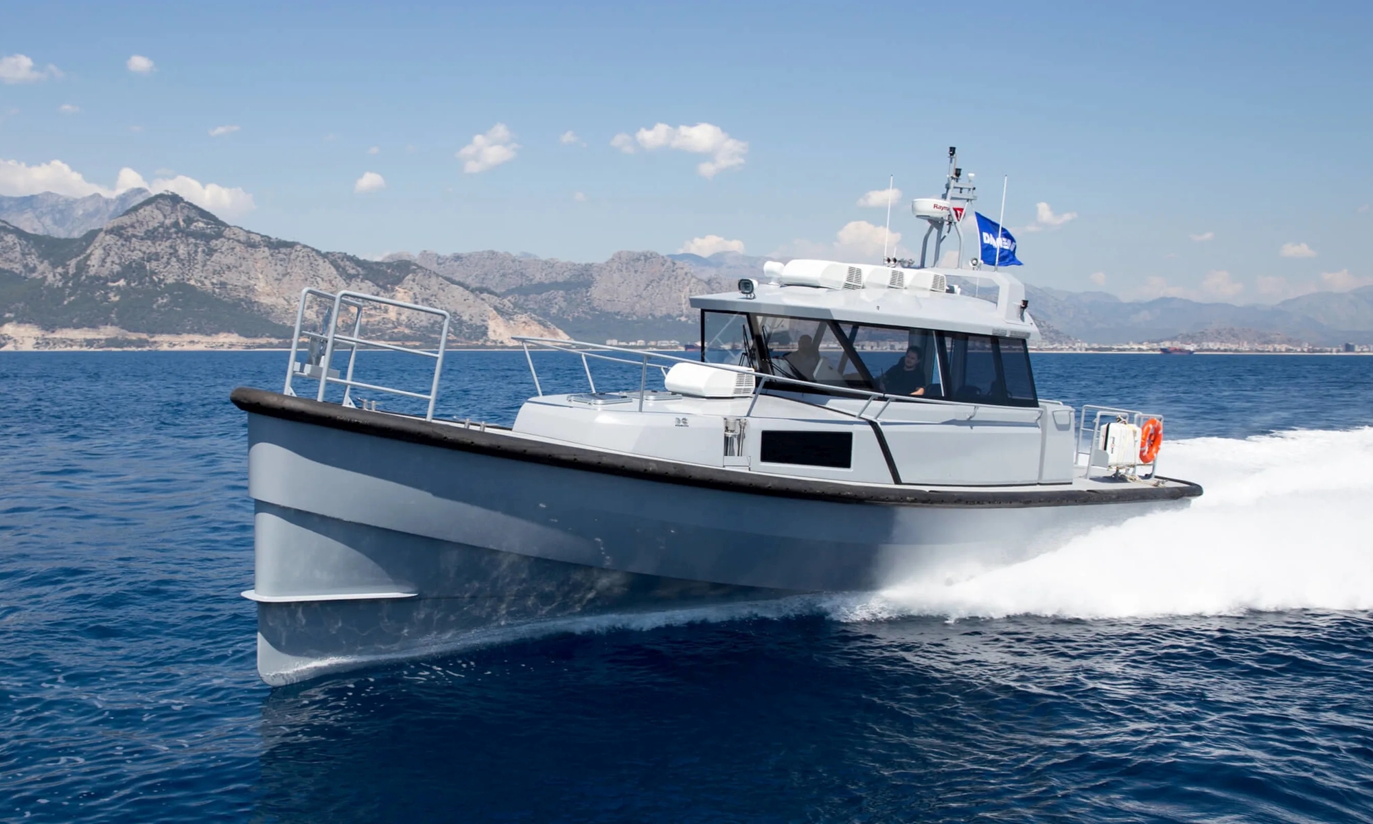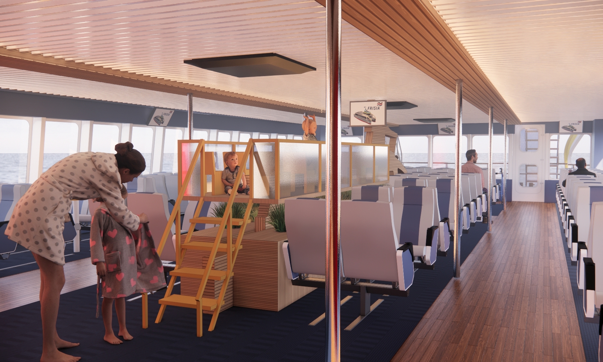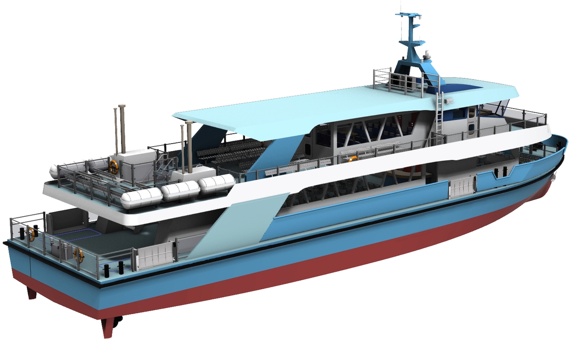 Op de render is de E-LUV 2208 te zien, een robuuste werkboot, in aanbouw in UK, uitgerust met 2.4 MWh batterij pakket. Om operaties in afgelegen gebieden mogelijk te maken wordt het schip voorzien van een batterij container op de wal.